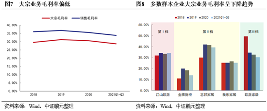 大宗業務“量大利薄”,其增速放緩對第I、II檔企業及中小規模企業影響較大,未來競爭加劇,其盈利空間將持續被壓縮。大宗業務經歷2018-2019年的快速增長,2020年受疫情、地產調控等影響增速放緩,2021年以來地產調控升級,房企資金壓力上升,雖然企業積極拓展同優質房企的合作,卻未能阻止大宗業務增速下滑。2021年三季度江山歐派、我樂家居的大宗業務分別同比下降24.11%和14.62%。