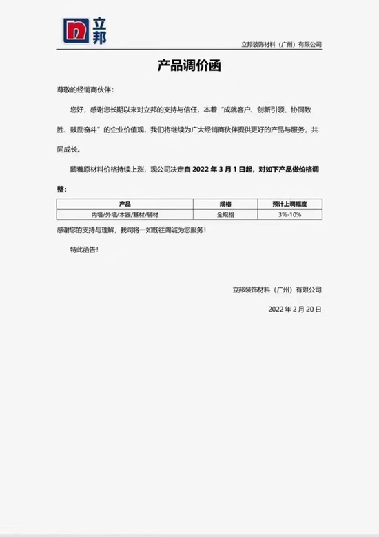 2022年2月20日,立邦裝飾材料(廣州)有限公司發布產品調價函稱,隨著原材料價格持續上漲,現公司決定自2022年3月1日起,對內墻/外墻/木器/基材/輔材等產品,預計上調幅度3%-10%。