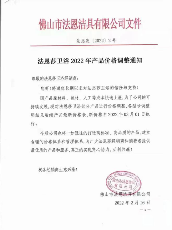 2022年2月16日,法恩莎衛浴也發布了2022產品價格調整通知,通知顯示,因產品原材料、包材、人工等成本快速上漲,為了公司的可持續發展,現對法恩莎衛浴部分產品進行價格調整,各型號調整明細見后續產品最新價格表,新價格自2022年03月01日執行。