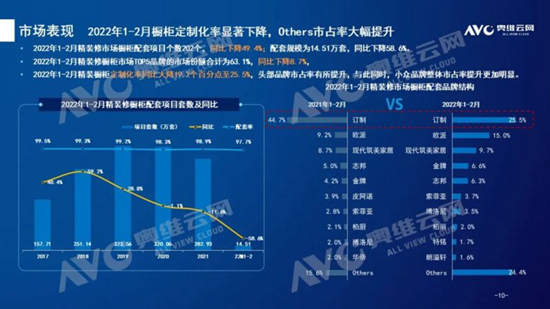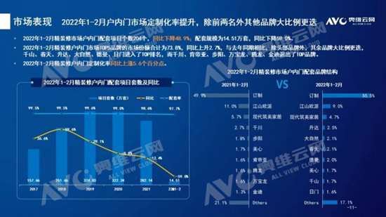 市場(chǎng)端,2022年1-2月,精裝修市場(chǎng)櫥柜、木地板定制化率顯著下降,腰部品牌、Others市占率上漲明顯,戶內(nèi)門市場(chǎng)定制化率有所上升,除前兩名品牌外其他品牌大比例更迭。