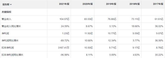 報告顯示,2021年索菲亞實現營業收入104.07億元,同比上升24.59%。兌現了2021年初定下的百億營收目標。歸屬于上市公司股東的凈利潤1.23億元,比上年減少約10億元,同比下降89.72%。扣除非經常損益后的歸屬母公司股東凈利潤為0.32億元,同比減少96.98%。