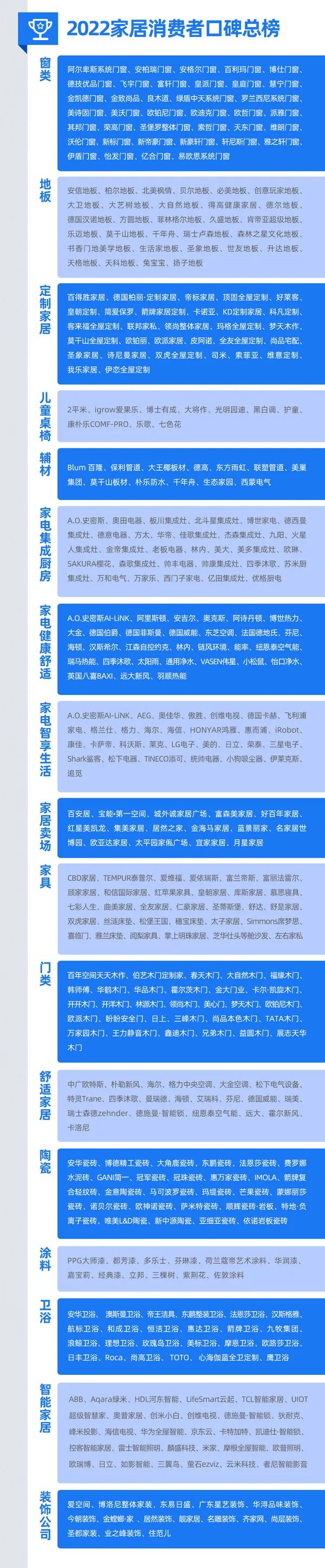 為營造家居行業安全放心的品質消費環境,倡導正確消費理念,于2022年5月26日,發布《2022中國家居消費者口碑藍皮書》。該藍皮書以《2022中國家居消費者口碑問卷調查》為藍本,在為期55天的調查過程中,累計收到有效問卷53.6萬份,超2600家企業參調。