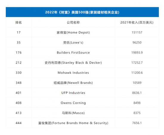除了家居設(shè)備和家具行業(yè),今年同樣有部分來自建材產(chǎn)品或建材零售領(lǐng)域的企業(yè)上榜。其中,美國知名的連鎖建材零售商家得寶(Home Depot)總排名第17位,較去年上升一位;而同樣是建材零售商的美國勞氏公司勞氏(Lowe's)則排名第35位。此外,在建筑及玻璃行業(yè)中,也有3家企業(yè)登榜,分別是Builders FirstSource、UFP Industries和Owens Corning。