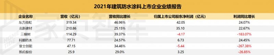 在2021年房地產景氣度下行的背景下,位于上游的建筑防水企業基本實現了逆勢增長。其中表現最搶眼的要數東方雨虹,不僅營收增長了46.96%,利潤也增長了24.07%,形成了遠超對手的規模優勢。北新建材與科順防水也同樣實現了營收和凈利潤的雙增長。