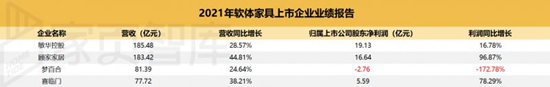 2021年,4大軟體家居上市企業均實現了營收增長,其中敏華控股與顧家家居依然居于領先地位,營收分別為185.48億元和183.42億元,同比增長28.57%和44.81%。