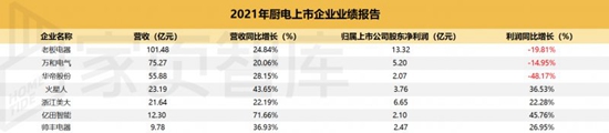 2021年,中國廚電上市公司基本都實現了營收增長,其中老板電器更是突破百億元。億田智能營收增速亮眼,高達71.66%。其他企業也都實現了兩位數的增長。可以預見,廚電行業的增長空間還有很大。