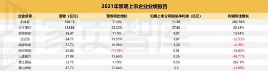 9家照明上市企業中,木林森的表現最優秀,其營收186.15億元,同比增長7.1%;凈利潤11.58億元,同比增長283.76%。
