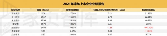2021年,7家家紡上市企業中,除了真愛美家營收增長4.47%,其他企業均實現了兩位數的增長。其中營收增長率最高的水星家紡,跟去年同期相比增加了25.19%。羅萊生活與孚日股份營收也突破了50億大關,分別為57.6億元和51.57億元,同比上漲17.3%和16.36%。