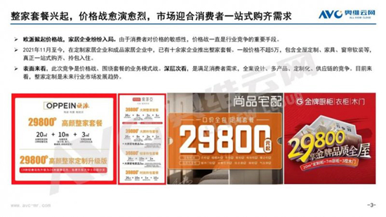 隨著越來越多的家居企業(yè)步入整裝市場(chǎng),價(jià)格戰(zhàn)成為了不可避免的競(jìng)爭(zhēng)策略。2021年11 月以來,已有十余家企業(yè)推出整家套餐,一般價(jià)格不超5萬,包含全屋定制、家具、窗簾軟裝等內(nèi)容。