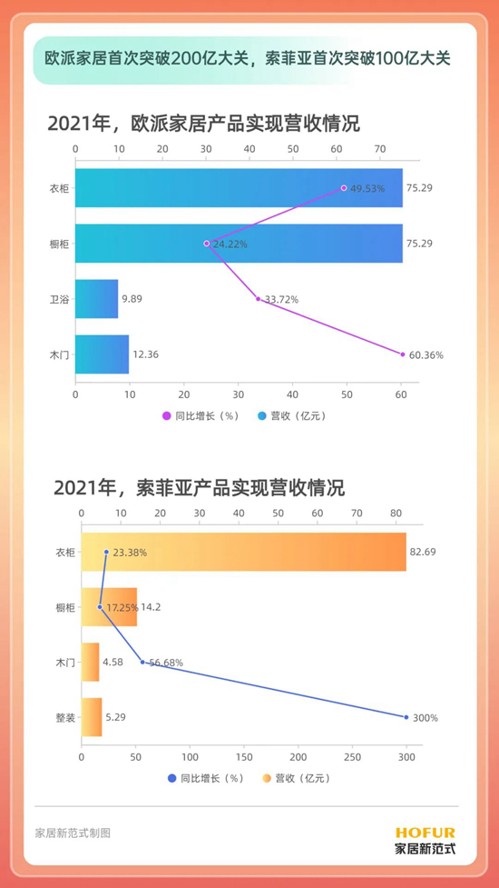 和歐派家居布局相似的,還有索菲亞。財報顯示,索菲亞衣柜及其配套產(chǎn)品、櫥柜、木門分別實現(xiàn)營收82.69億元、14.2億元和4.58億元,同比增長分別為23.38%、17.25%和56.68%,另外,整裝渠道收入5.29億元,比2020年實現(xiàn)3倍增長。