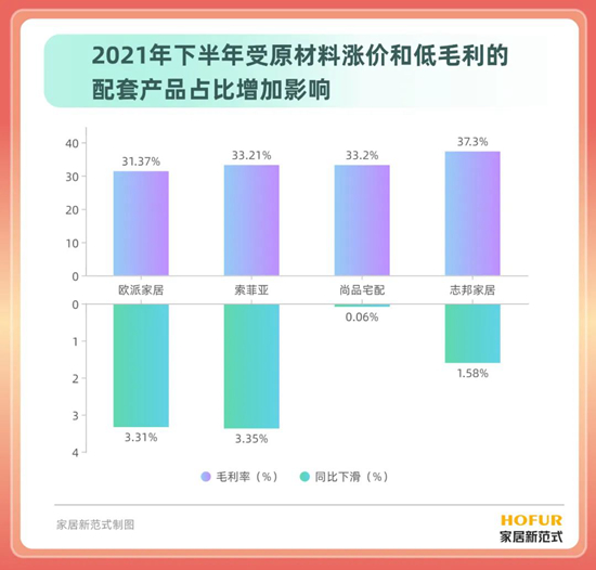 而從毛利率來看,下半年受原材料漲價和低毛利的配套產(chǎn)品占比增加影響,4家企業(yè)毛利率普遍下滑。 2021年,歐派家居、索菲亞、尚品宅配和志邦家居毛利率分別為31.37%、33.21%、33.2%和37.3%,同比下滑分別為3.31%、3.35%、0.06%和1.58%。