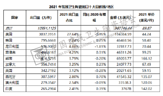 根據建筑衛生陶瓷協會數據,2021年,我國建筑衛生陶瓷產品(不包括五金衛浴類產品)累計出口金額為157.70億美元(約人民幣1055.83億),同比增長11.43%。其中,衛生陶瓷出口額達98.78億美元,口量為1.10億件,歐美等發達國家和地區的份額接近出口總量的二分之一。
