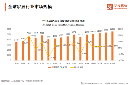 數據顯示,2010-2025年全球家居市場規模呈現波動上升的趨勢。2021年,全球家居市場規模為4962億美元,同比增長率為,預計在未來四年中,全球家居的市場規模繼續增長,但其增長幅度卻維持在3%左右。艾媒咨詢分析師認為,雖然全球家居行業受到疫情影響,但其市場規模的上升空間大,各品牌間的競爭加劇。