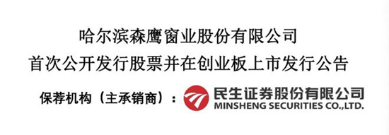 9月2日,哈爾濱森鷹窗業發布公告稱,公司首次公開發行股票并在創業板上市申請已經深圳證券交易所創業板上市委員會審議通過,并已經中國證券監督管理委員會同意注冊。公告顯示,將于9月14日網上申購,本次發行價格38.25元/股,預計募資新增2.34億元至9.07億元。