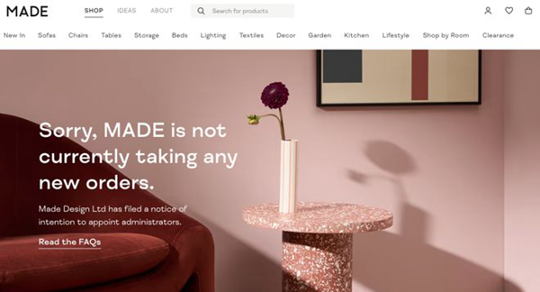 鯨網跨境獲悉,英國家具獨立站品牌Made,此前為了籌集7000萬英鎊的資金渡過財務危機,尋找合適的買家“賣身”自救。但是在9月底和潛在賣家談判失敗后,其獨立站Made.com能正常瀏覽,但是暫停接受任何新訂單。其公司發(fā)出警告,如果在現(xiàn)金儲備完全耗盡之前無法籌集到進一步資金,將“采取適當措施為債權人保留價值”。即申請破產。