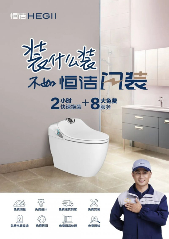 恒潔的“閃裝”智能馬桶換新服務, 提供最快“2小時快速換裝+8大免費服務”,包括免費測量、設計、送貨到家、安裝、電路改造、拆舊、舊品處理、通檢等服務,解決翻新改造中馬桶更新的痛點。