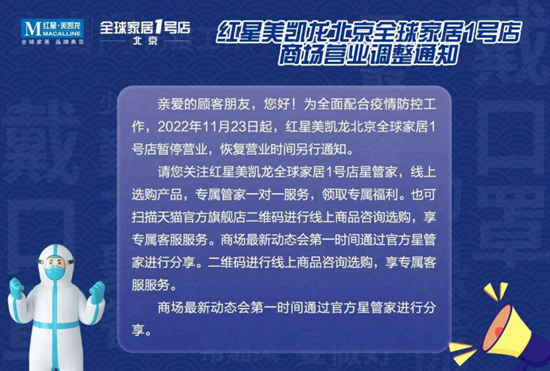 通知顯示,為全面配合疫情防控工作,2022年11月23日起,紅星美凱龍北京全球家居1號店暫停營業,恢復營業時間另行通知。