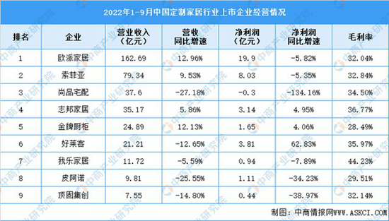 歐派家居優勢顯著,營收及同比增速雙第一,且凈利潤接近20億元,凈利潤超過其他八家之和,進一步穩固了市場地位。其次是索菲亞,營收79.34億元,同比增速9.53%。
