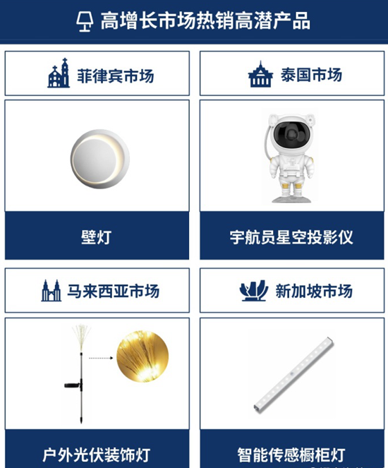 高客單價燈具產品的特點可總結為多功能、快時尚、新能源、物聯網等。基于用戶需求,跨境賣家應聚焦于持續的產品創新,短期創新點在風格和款式上、中期創新點在功能和品類上。比如風靡東南亞市場的網紅裝飾燈“日落燈”,往往是跨境賣家將國貨流行款帶向當地市場并引領爆單潮流。