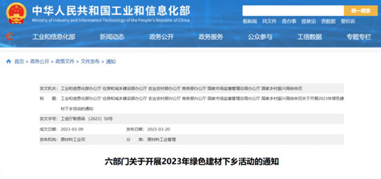 3月20日,工業和信息化部辦公廳、住房和城鄉建設部辦公廳、農業農村部辦公廳、商務部辦公廳、國家市場監督管理總局辦公廳、國家鄉村振興局綜合司發布《關于開展2023年綠色建材下鄉活動的通知》。