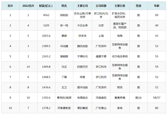 從排名來看,農夫山泉鐘睒睒已連續第三年奪魁,且遙遙領先第二位。張一鳴和黃崢位居前三;緊隨其后的寧德時代曾毓群、順豐控股王衛、牧原股份秦英林/錢瑛、美的集團何享健家族同樣位列榜單前十。