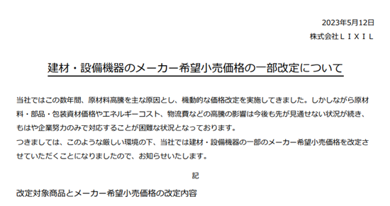 今年5、6月份,包括驪住、Takara Standard在內的日本企業發布了新一輪調價公告。驪住5月12日公告稱,由于近年原材料價格高企,公司此前已適時實施了調價措施,但由于目前原材料、部件、包裝、能源、物流等成本持續上漲,決定再對部分產品的建議零售價進行上調。