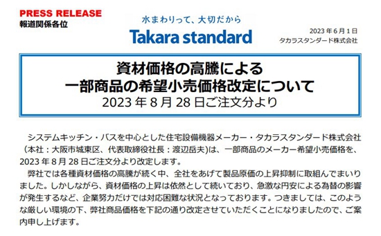 隨后的6月1日,另一家衛浴企業Takara Standard也宣布漲價。該公司發函稱,由于原材料價格上漲及激烈的日元貶值,決定自8月28日起上調產品的建議零售價,其中,整體衛浴價格平均上調14%,淋浴及馬桶產品平均上調16%。Takara Standard表示,公司將持續推進經營合理化,以更大力度開發新產品及提升服務質量,希望各界對本次漲價行為表示理解。