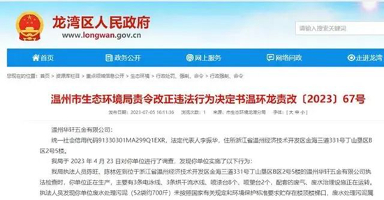 7月5日,溫州市龍灣區人民政府網站發布溫州市生態環境局責令改正違法行為決定書(溫環龍責改〔2023〕67號)。內容顯示,溫州一衛浴五金企業未按照國家有關規定和環境保護標準要求貯存危險廢物,溫州市生態環境局依法對其處以10萬元以上100萬元以下的罰款。