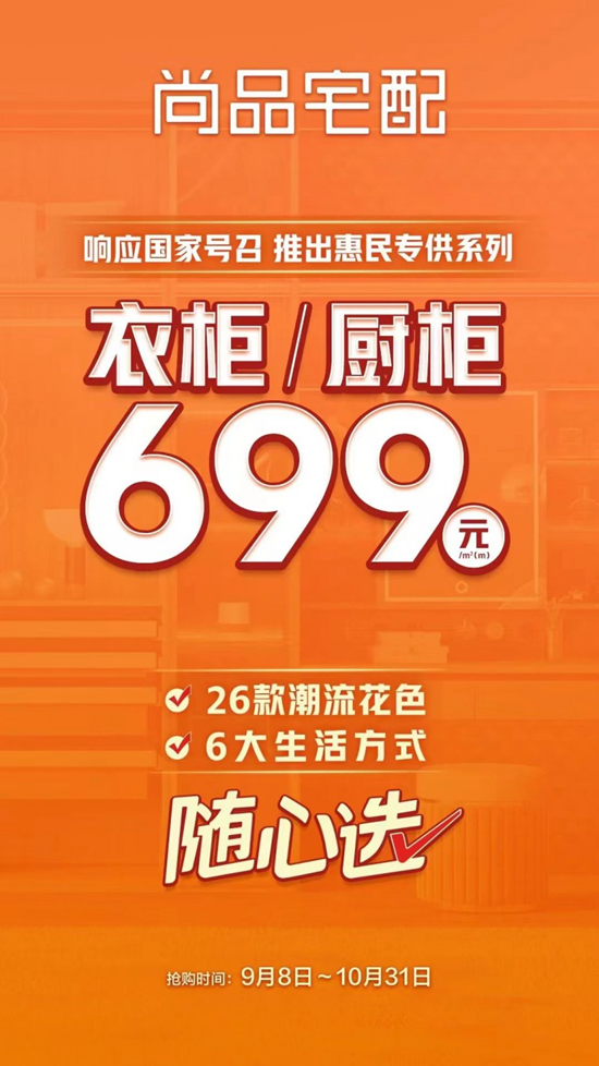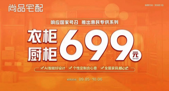 而同樣作為定制頭部品牌的尚品宅配,也果斷發布惠民專供系列,同步推出全民普惠鉅惠讓利:即日起至10月31日,衣柜699元/㎡,廚柜699/m,限時限量搶購。同一天(9月8日),索菲亞也官宣整家套餐加碼799元/㎡政策。至此,定制三強悉數真 槍實彈上場價格鏖戰,一時間行業更加熱鬧。