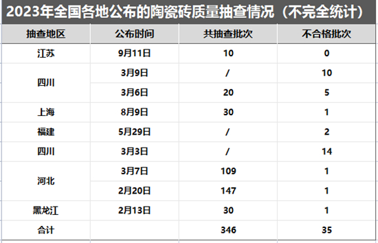 除此之外,江蘇、福建、四川、上海等地市場監督管理局也通報了陶瓷磚產品質量監督抽查的相關情況,經檢驗,合計抽查的346批次陶瓷磚,有35批次陶瓷磚不合格。